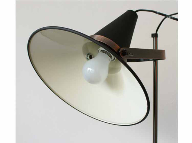 細長く特徴的なアームに、魔法使いの帽子のような個性的なシェードを持つアンティークなテイストのフロアライトです。そしてなんといってもシェードが180度回転するところですね。手元を照らし読書をするのもよし、天井に向けて照らし、間接照明として使うもよし。