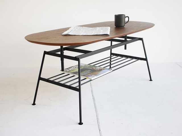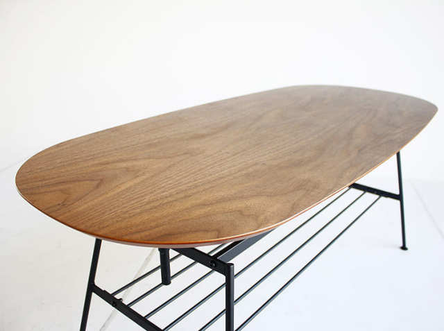40/43/46/49/52cmの5段階で高さ調節が可能。直接床に座る際には40cm、ソファで食事をとる際は52cmなど、シーンに合わせて最適な高さに調節いただけます。 天板はオーバル型で、ビンテージな味わいにやさしい雰囲気をプラスしています。 天板下のスチール棚には、読みかけの雑誌やティッシュケース、リモコンなどの収納に。 スチール部分は粉体塗装を施し、サビにくくキズがつきにくい仕様に。 脚裏にはフェルトつきで、床を傷つけにくい配慮も。