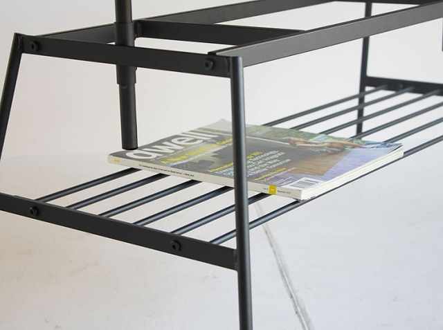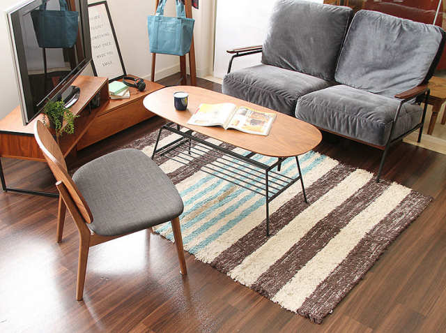 スチール棚つきのローテーブルは、リビングのソファ前にぴったり。