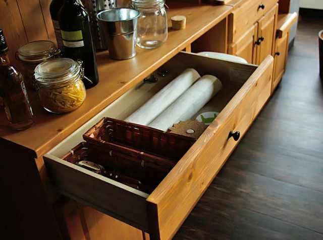 左上段の引き出しはカトラリーなどを収納するのにぴったりです。