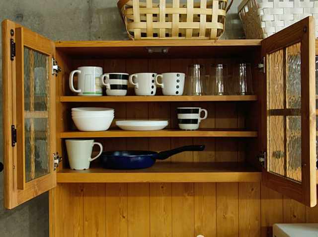 扉には型板ガラスを使用しています。うっすらと収納されている食器などが見えます。