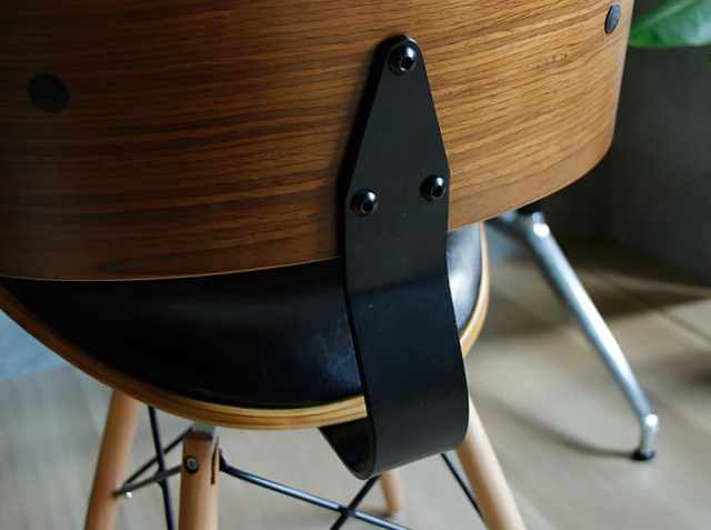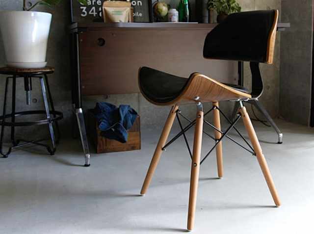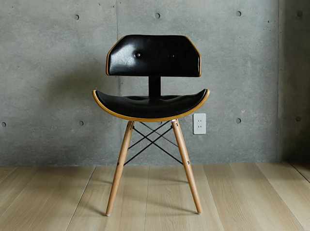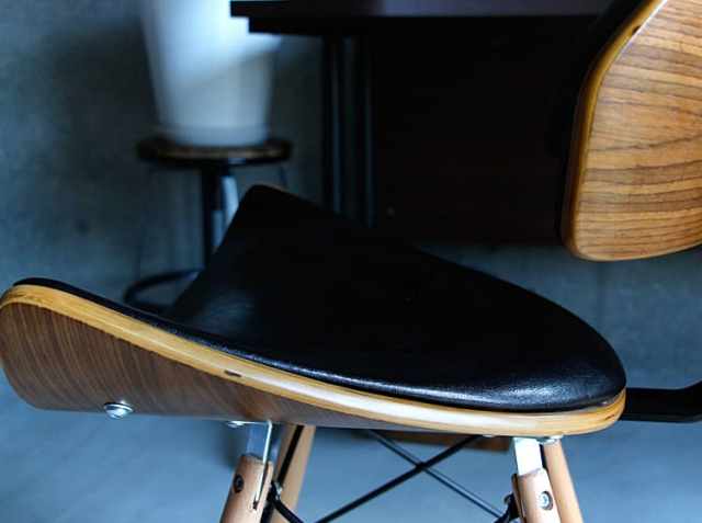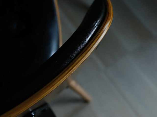 ブラウンの木目とブラックレザーがとても調和のとれた落ち着いた雰囲気の大人にふさわしいチェアです。