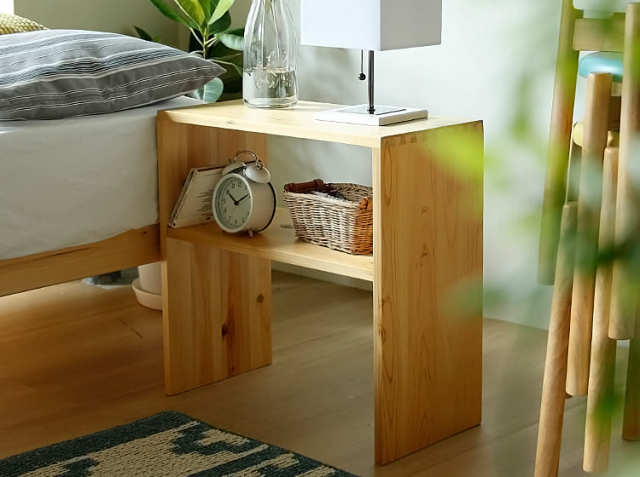 ベッドサイド用にぴったりの高さで設計されたサイドテーブル。天然木ひのき無垢材は、優しくあたたかな雰囲気を漂わせてくれます。オープン収納部分には、読みかけの本や小物類をスマートに収納し、天板には間接照明や観葉植物などを置くとおしゃれな空間の出来上がりですね♪