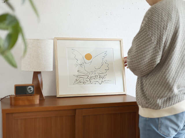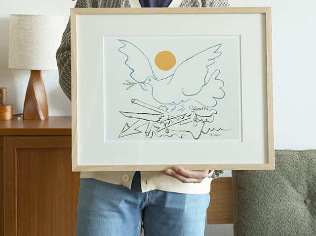 お部屋の印象を決めるアートポスター。大きいポスターを一枚飾るだけでも、お部屋の雰囲気を一気に変えることができます。20世紀最大の芸術家、パブロ・ピカソのアートポスター。数々の動物を描いた作品の中でも線でシンプルに鳩(ハト)を描いたかわいい作品です。お部屋を優しく包み込んでくれる、天然木を使用したナチュラルフレームでお届けします。