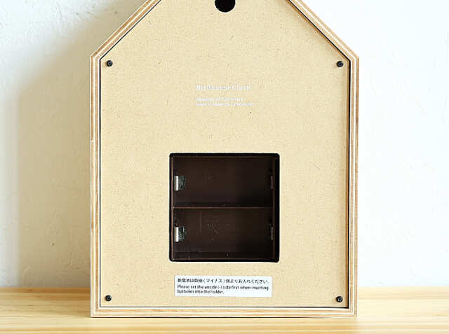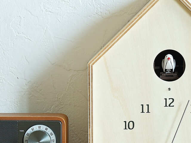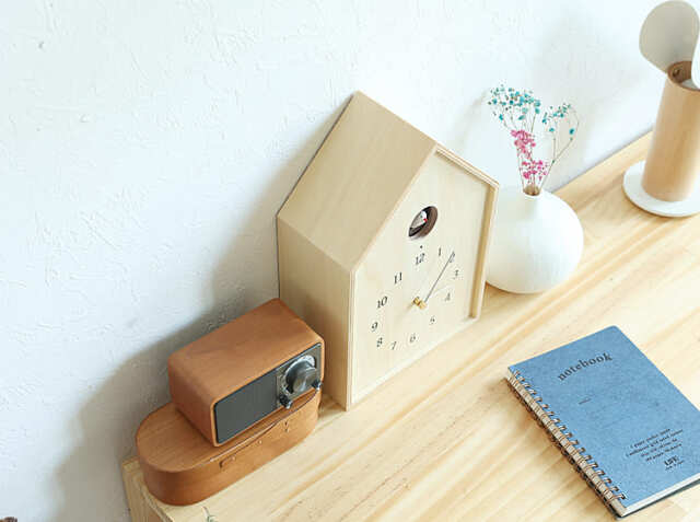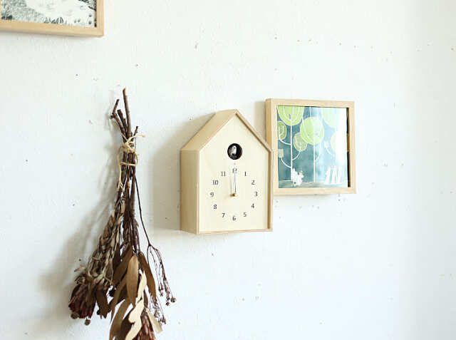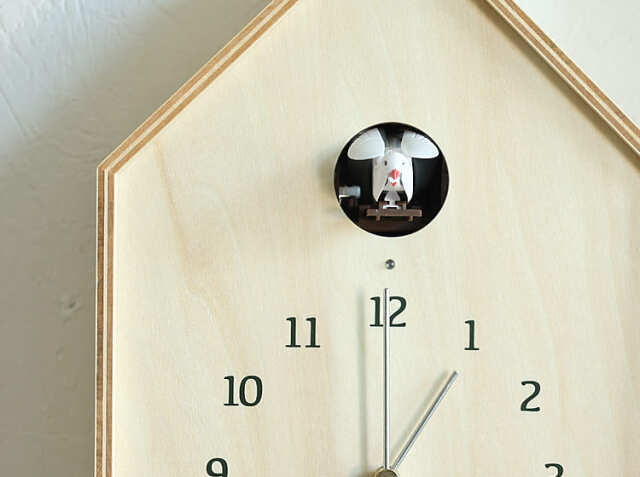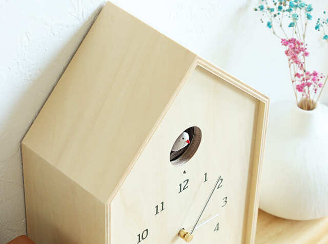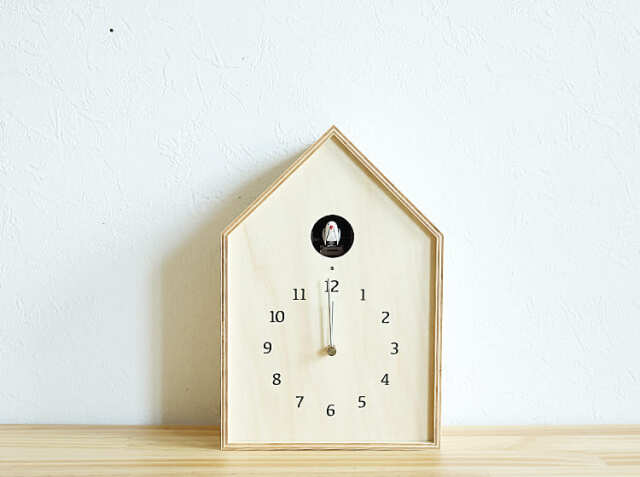 シナべニアを組み上げた巣箱をイメージしたさんかく屋根の時計。天然の素材を使用している からこそのナチュラルなやさしい雰囲気でお部屋にアクセントを加えてくれますよ。窓から顔を出す小鳥が、小川のせせらぎと共に時間を知らせてくれます。掛け時計としてはもちろん、置き時計としても使うことができるので、壁にフックが取り付けることが出来ない場所でも置くことが出来ますのでお家の色々な場所でカッコーの鳴き声が響き渡りますね。