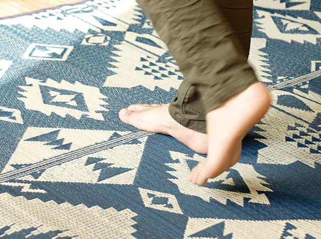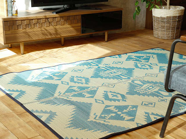 夏インテリアと相性の良いネイティブデザインと、い草本来の素材感や色味の組み合わせが絶妙。カラーは、ネイビーとブルーの2色からお選びいただけます。