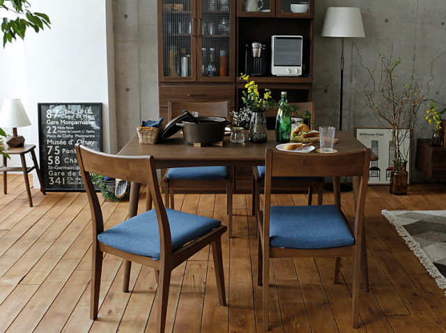 同シリーズのダイニングテーブルとブルーカラーのコーディネート
