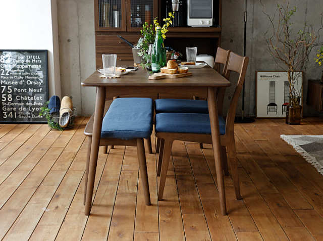 木目が綺麗なアルダー材を使った、落ち着いた風合いのブラウンカラーとカバーリング仕様のナチュラルカバーが特徴の幅125cmのダイニングテーブルとダイニングチェアーBタイプ2脚、ダイニングベンチの4点セット。