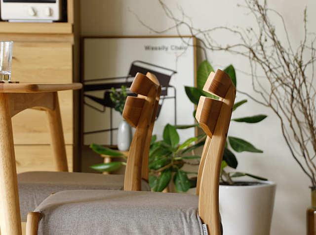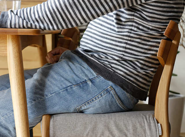 ダイニングでお食事をするときやお友達と団らんをするときなど食卓での時間がながくなれば同じ姿勢や体勢でいることって結構つらい、、。でもこのチェアーは、背もたれのフレームに傾斜をつけ、背もたれ部分に弧を描いた設計にすることで、背中を持たれたときにフィットし、永くお座り頂いてもストレスを感じることがありません。また天然木の木目と相まってとても綺麗でスタイリッシュさを感じることができます。