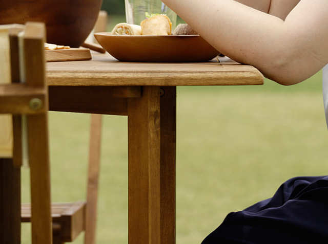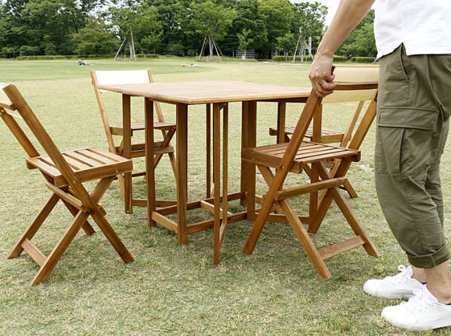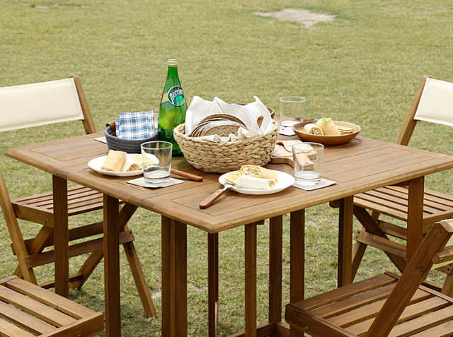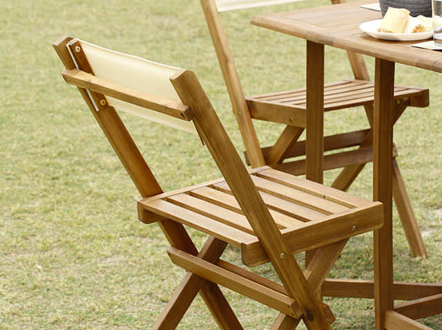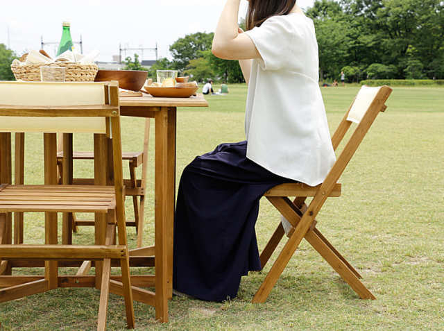 テーブルとチェアの折りたたみは女性の方でも簡単にできる設計に♪テーブルを広げた時の天板のサイズは、幅90cm×奥行き90cm。大人の方4人分のお食事を並べても十分余裕のある広さ。アカシア材の温かみを感じる風合いは、お家のテラスやバルコニー・お庭、そしてお外で過ごす時間を心落ち着かせてくれそうですね♪