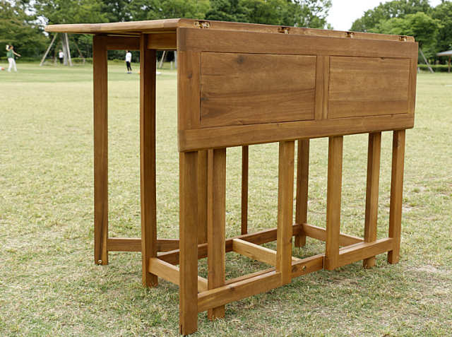 さぁ、それでは早速使ってみましょう。まずはテーブルの折りたたまれている天板を持ち上げて脚部を出します。