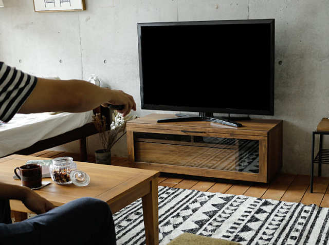 節を残したラフな質感のパイン無垢材に、ブラックパーツをアクセントにしたヴィンテージテイストの幅100cmテレビボード、Kais(カイズ)。
