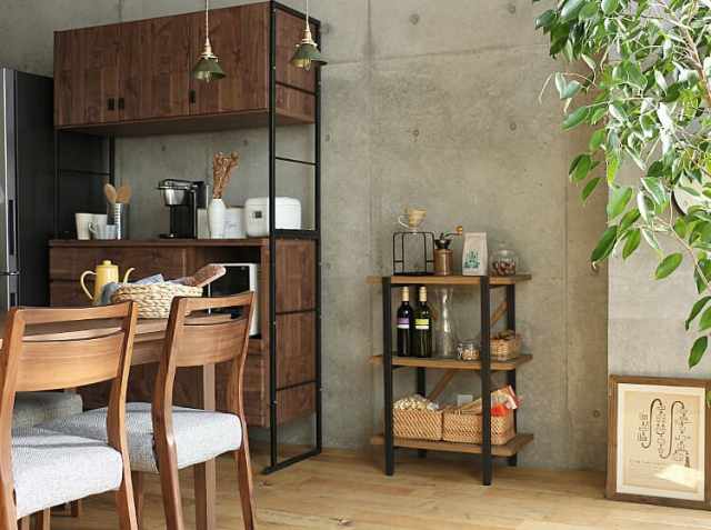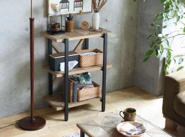 まるで昔から使ってるかのような温かみと風合いを出すために、古材風にエイジング加工を施した天然木パイン材を幾何学的に配置した個性的な天板。そしてフレームにはブラックスチールを組み合わせ、ヴィンテージ感を演出してくれる幅60cm3段タイプのオープンラック、KALEIDO(カレイド)。