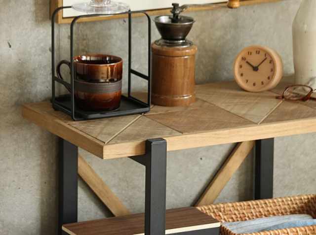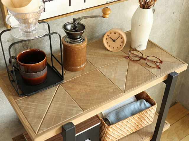 くっきりとした木目が特徴のパイン材を三角形に切り出し、幾何学模様に配置し、使い込まれたかのような古材風に仕上げたヴィンテージを感じる天板。色むらなどをつけることで、届いたその日から、昔からお家にあるかのような佇まいを感じていただけるアイテムとなっています。