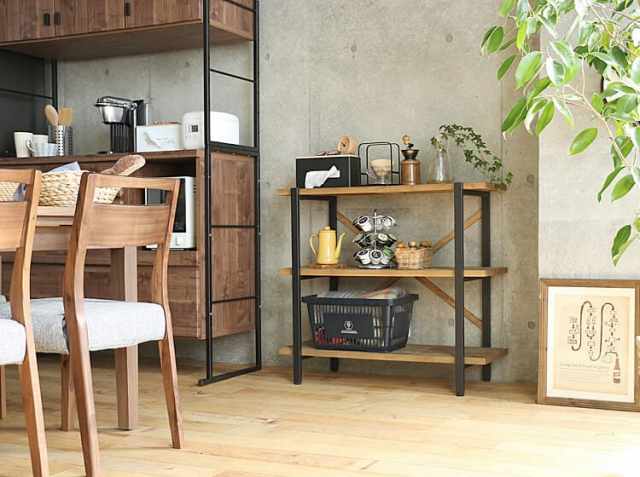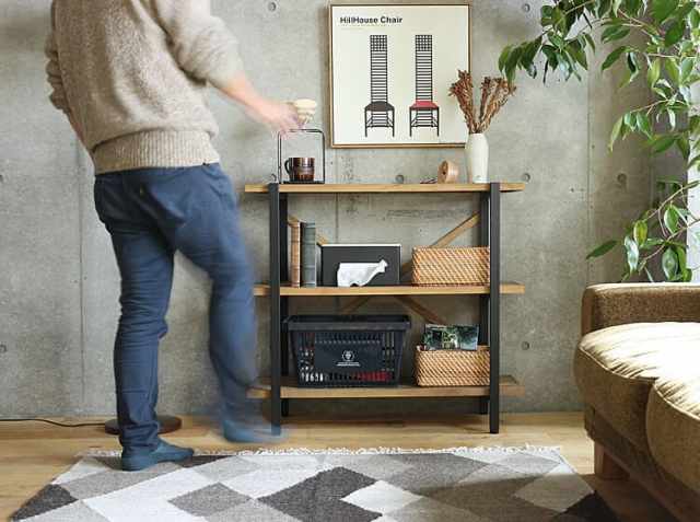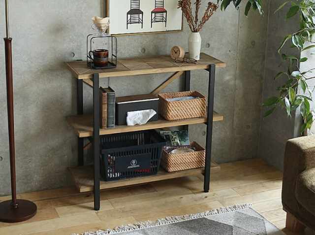 まるで昔から使ってるかのような温かみと風合いを出すために、古材風にエイジング加工を施した天然木パイン材を幾何学的に配置した個性的な天板。そしてフレームにはブラックスチールを組み合わせ、ヴィンテージ感を演出してくれる幅90cm3段タイプのオープンラック、KALEIDO(カレイド)。