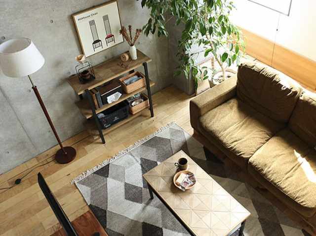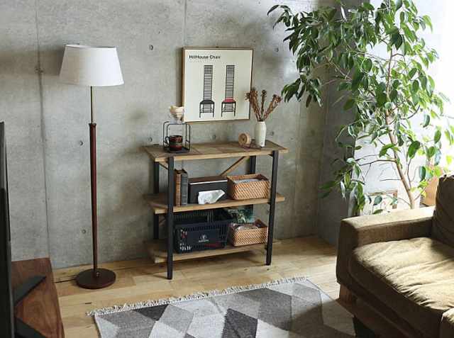 こちらのラックの特徴は、何といっても個性的な天板。三角形に切り出した古材風のパイン材を幾何学的に配列することで独特なデザインに仕上げています。また天然木の持つ自然の濃淡がグラデーションを生み、光の当たり具合で様々な表情を見せてくれますよ♪