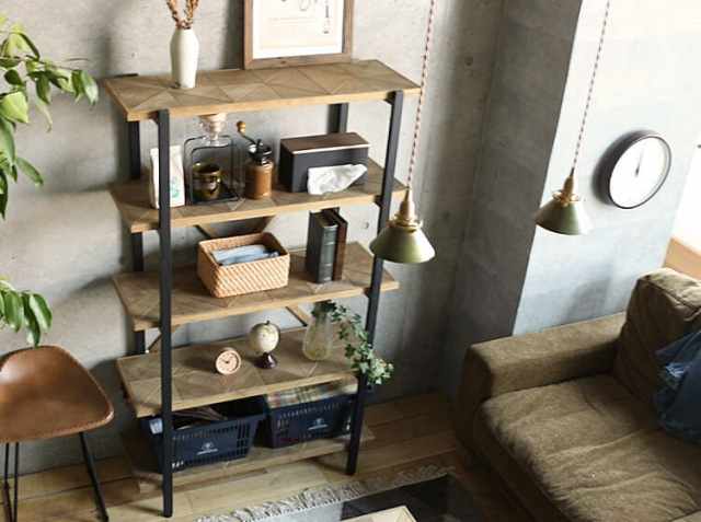 まるで昔から使ってるかのような温かみと風合いを出すために、古材風にエイジング加工を施した天然木パイン材を幾何学的に配置した個性的な天板。そしてフレームにはブラックスチールを組み合わせ、ヴィンテージ感を演出してくれる幅90cm5段タイプのオープンラック、KALEIDO(カレイド)。