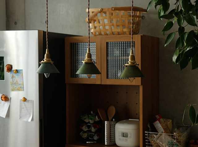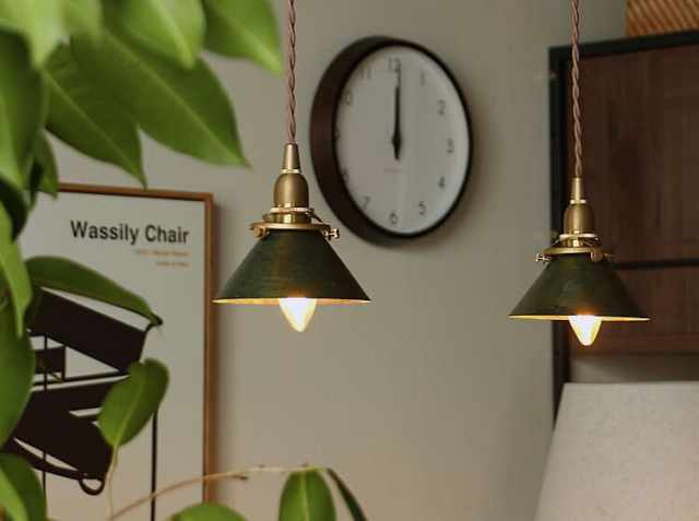 レトロ感のある真鍮のソケットに、円錐型シェードを取り付けた、アンティーク風のペンダントライト。キッチン・リビング・ダイニングのテーブルの上に飾るだけでまるでカフェ風のインテリアに。