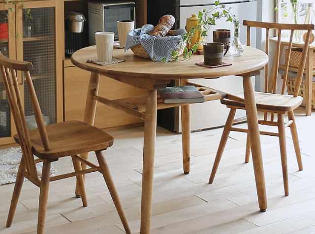 温かみのあるバーチ無垢材とほっこり優しいデザインがお部屋に癒しの空間を与えてくれる、円形ダイニングテーブル Logie(ロジー)。