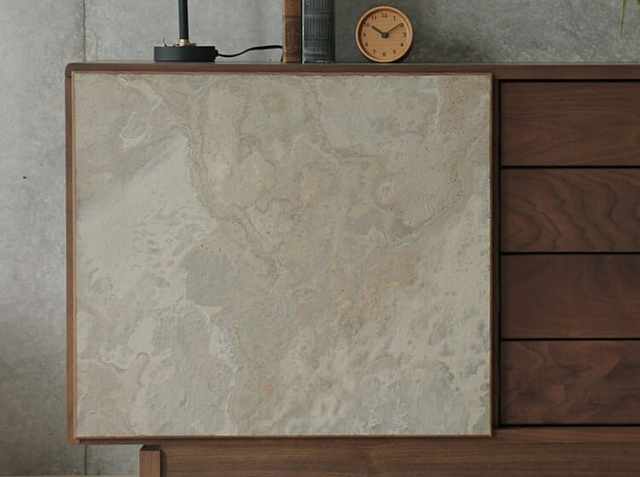 家具の名産地北海道の旭川家具×特許シートの「HANDY STONE」を組み合わせ、上質な空間を演出する幅120cmのリビングボード、Flav(フレーブ)。