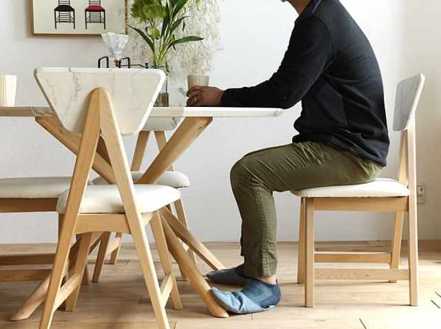大理石模様の背もたれは、緩やかに傾斜がつけられていますので背中をもたれたとき自然とフィットしてくれて、座面高も42cmと標準的なサイズとなっていますのでリラックスしてくつろぐことができますよ。同シリーズのテーブルと合わせてコーディネートすれば、上品さと温かみを感じる個性的なダイニングシーンの出来上がりですね。