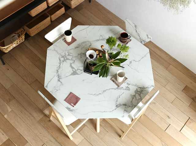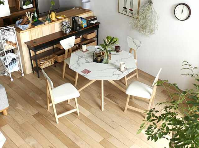 大理石模様をまとったインテリア。シンプルで無駄のない空間に悠然と佇む大理石調デザインと天然木の組み合わせが気品の高さとモダンな雰囲気でお部屋を彩ってくれるダイニングテーブルとダイニングチェア4脚のダイニング5点セット、Collet(コレット)8角形タイプ。