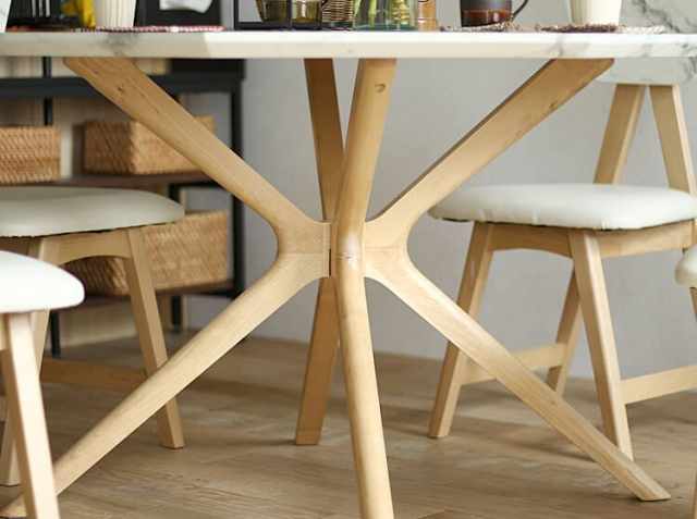 天然木バーチ材をクロスしたデザイン性の高さを感じる脚部となっています。幕板がないタイプとなっていますので、座ったとき足元にゆとりができてリラックスしてお食事を楽しんでいただけますよ♪
