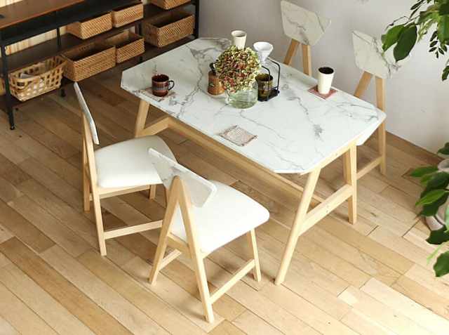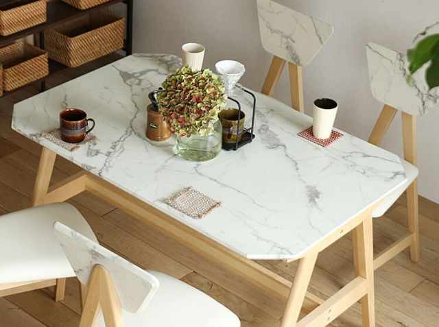 大理石模様をまとったインテリア。シンプルで無駄のない空間に悠然と佇む大理石調デザインと天然木の組み合わせが気品の高さとモダンな雰囲気でお部屋を彩ってくれるダイニングテーブルとダイニングチェア4脚のダイニング5点セット、Collet(コレット)。友人や家族との大切な時間、食後のコーヒータイムまでダイニングでゆっくり寛いでみてはいかがでしょうか。角面は丸みをもたせていますので、小さなお子様がおられるご家庭でも安心してご利用いただけます。表面の塗装は耐久性と耐水性のあるPU塗装を施していますので、飲み物などがこぼれた時でもサッと拭けてお掃除がラクラクですよ♪