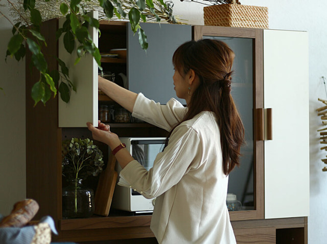収納している食器などが見えるクリアーガラスとベージュカラーの組み合わせがモダンな空間を演出してくれます。