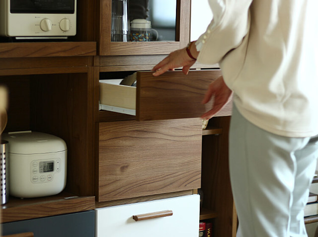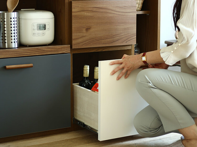 下段の引出し収納は、ワインボトルやパスタボトルなどの背の高いものの収納に便利ですよ。