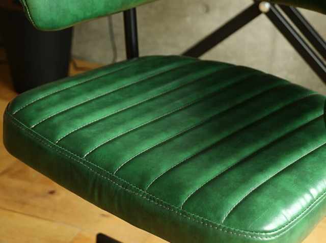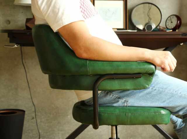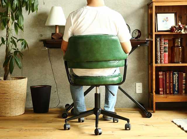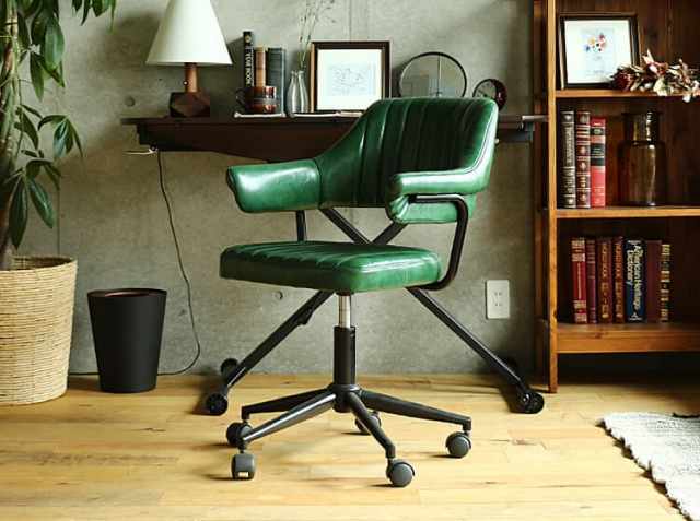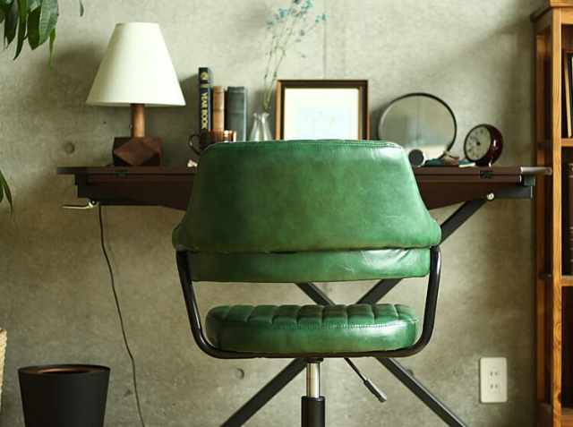 ヴィンテージ加工が施されたグリーンカラーのPUレザーが、大人の落ち着いた雰囲気を醸し出してくれる、ミッドセンチュリーテイストのデスクチェア Gooze(グーゼ)。