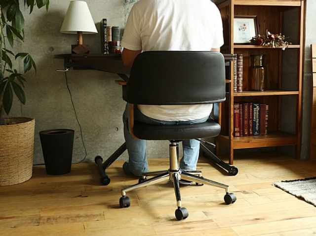 レトロな雰囲気が漂うデスクチェア。しっかり身体をホールドする形状のシートには、使い込んだ革のような風合いのPUレザーを張り込みました。高いデザイン性だけでなく、ガス圧による座面の高さ調節、座面の回転、移動がスムーズなキャスター付きと、チェアの基本的な機能は備えており、使い勝手も十分満足いく仕上がりです。安心して身体を預けられる感覚です。お仕事や作業に疲れたら、是非もたれかかってくつろぎの時間を過ごしてみてください♪