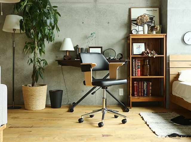 パソコンなどのOA機器や書類などに囲まれ、無機質なイメージになりやすい書斎やワークスペースを一新してくれるのがこちらのチェア。PUレザーと木目模様、スチールの異素材を組み合わせることで上質で洗練されたフォルムが、書斎やワークスペースをセンスアップしてくれるチェアですよ。