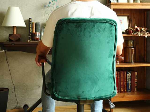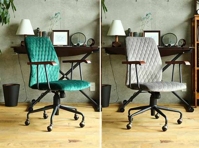 座面と背もたれ部分には、光沢のある肌触りが気持ちいベルベット生地を使用しています。ダイヤ柄の凹凸が高いデザイン性を感じることができるデスクチェア。またガス圧による座面の高さ調節、座面の回転、移動がスムーズなキャスター付きと、チェアの基本的な機能は備えており、使い勝手も十分満足いく仕上がりです。安心して身体を預けられる感覚です。お仕事や作業に疲れたら、是非もたれかかってくつろぎの時間を過ごしてみてください♪