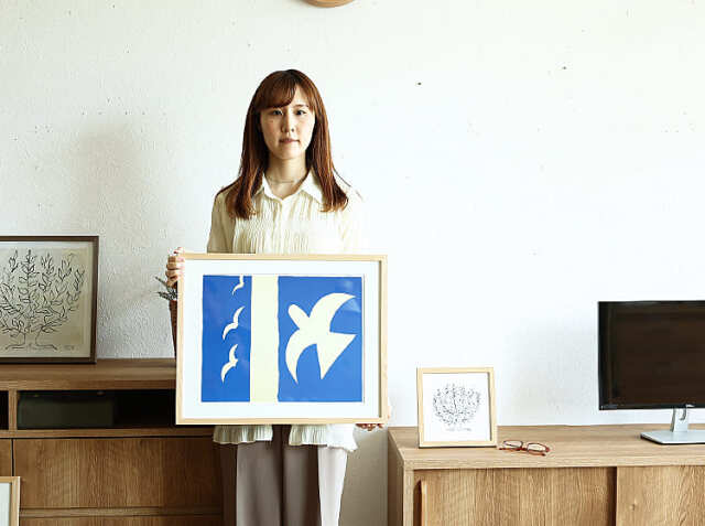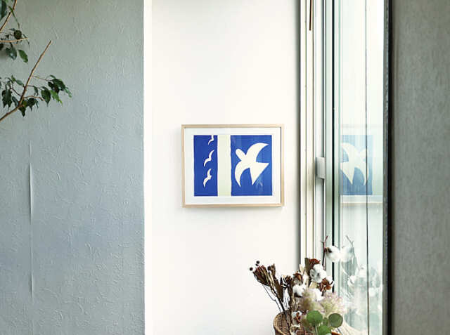 4羽の鳥をシンプルに描いた作風が柔らかい雰囲気を醸し出し、シンプルなインテリア空間に自然に溶け込みます。