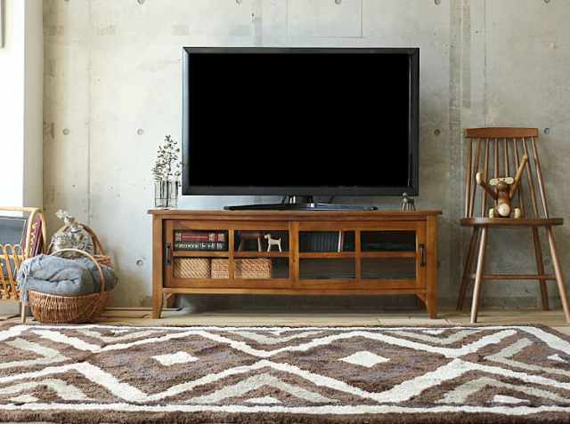 ローボードの高さは、標準的な45cm。ソファーに座ってテレビを見ながらくつろぐにも、ラグなどに座ってテレビを見るにもちょうどいいサイズ。一度落ち着いて座ってしまうと、立ち上がるのは結構おっくう、、。でもスライド式の扉には、3mm厚のクリアーガラスを埋め込むことで扉を閉めたままAV機器などのリモコン操作ができるようにしていますので、リラックスしてリビングでくつろぐことができますね。