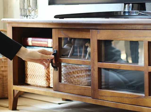 スライド式の扉収納には、DVDプレーヤーなどのAV機器などの収納にピッタリ。リビング周りに散らかりがちなDVDのパッケージやリモコン、雑誌などを収納するのにおすすめです。