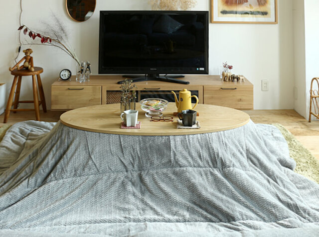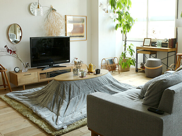 オーバルタイプのナチュラルカラーのこたつテーブルに相性が良いグレーカラー。明るくおしゃれな雰囲気にお部屋をしてくれますね♪