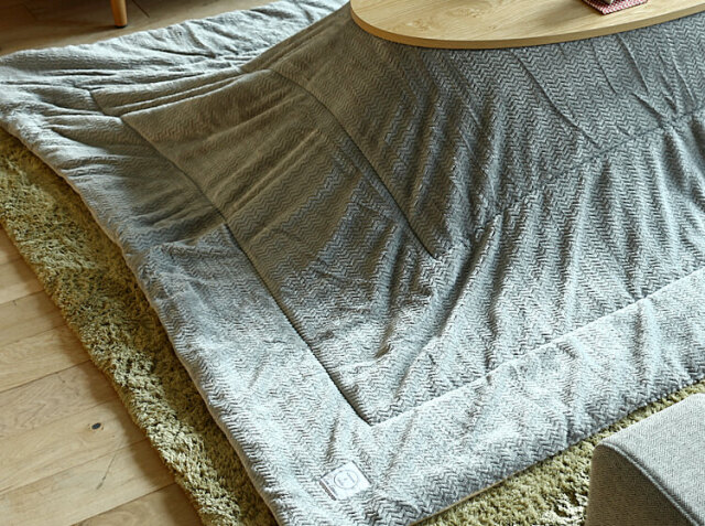ヘリンボーン柄を立体的にデザインした滑らかな肌触りが特徴の薄掛けこたつ布団、yuric(ユリック)。サイズは190cm×190cmの正方形タイプと190cm×230cmの長方形タイプからお選びいただけます。カラーはお部屋のテイストに合わせて選べるグレーとネイビーをご用意しました。