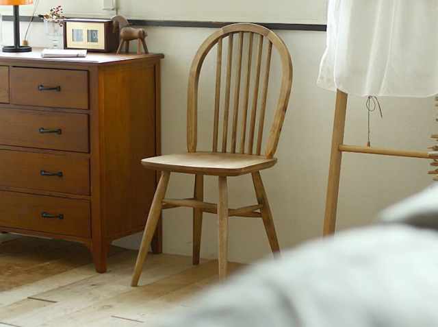 こちらのチェアを最初に見たときの印象は、木目のきれいさとイギリスの伝統的チェアであるウィンザーチェアのようなスタイリッシュなデザインが目に飛び込んできます。 素材には、きれいな木目でやさしい表情が特徴のバーチ無垢材を使用していますので、使えば使うほど経年変化が起こり、自分だけのオリジナルファニチャーに変化していくのも楽しみですよ♪