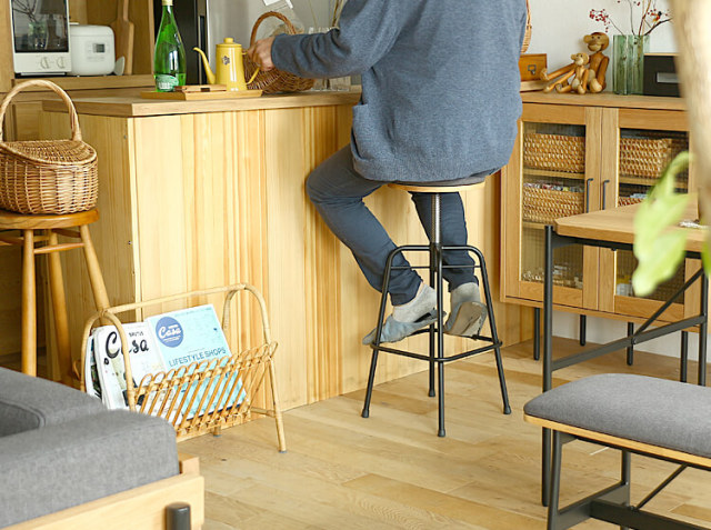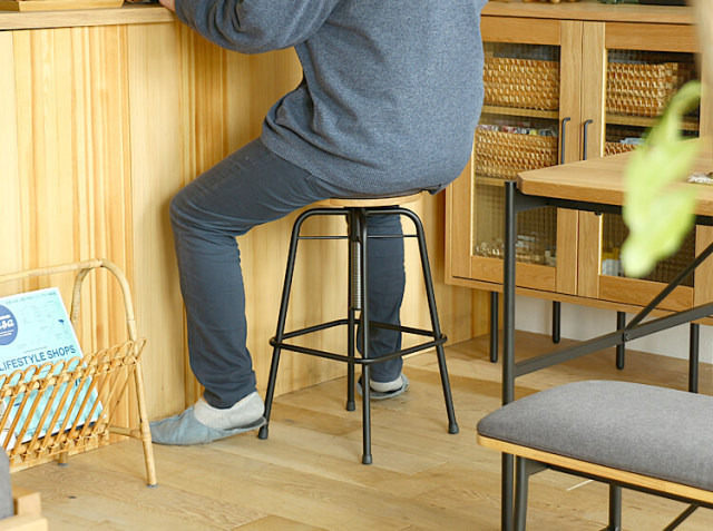 こちらのハイスツールは、座面部分をクルクルと回すと、高さ調整が59cm〜71cmの間で可能となっています。