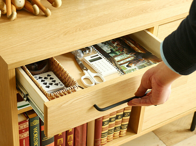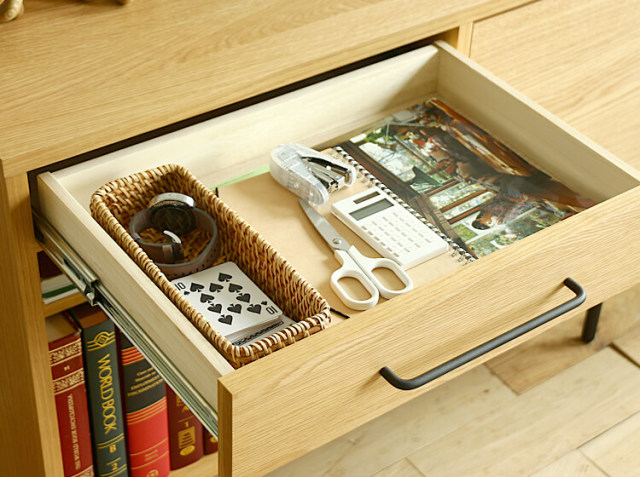 リビングやダイニング、寝室周りの小物を収納するのに便利な引出し収納。雑多に散らかりやすい文具などを収納したりするのにとても便利♪※引出しは、幅42cm×奥行き27.5cm×高さ5cmとなっています。