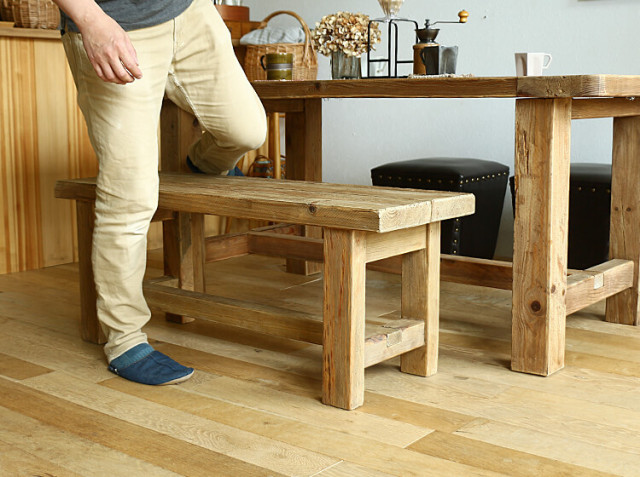 長年使いこまれた傷などをそのまま活かしたパイン古材を使用し、ダイナミックで重厚感溢れるベンチに仕上げています。