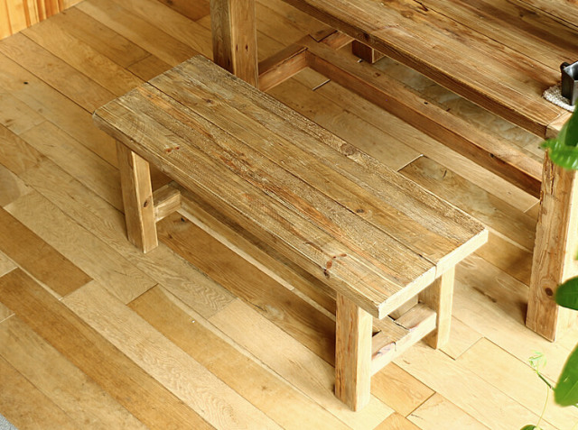 直線的なデザインを重視したシンプルなフォルムがパッと見たときの最初の印象。しかしよく見ると古材のもつ自然の濃淡や節の具合が、個性を主張するベンチということがわかります。 同じ節の形や位置などは存在しませんので、自分だけのオリジナルファニチャーのようで愛着がもてますよ♪