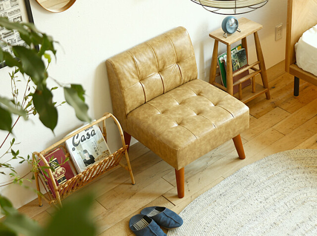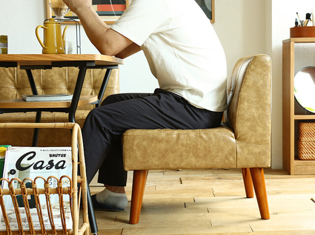 生地は、本革でよく見られる“シボ”=シワのような模様をエイジング加工を施すことで表現したバイキャストレザーを使用することで、まるで本物の革のような高級感を醸し出してくれる1人掛けソファーとなっています。またキャメルカラーの色味も、あえて少し薄めに仕上げることで昔から使っているかのようなヴィンテージ感もお部屋にもたらしてくれますよ♪
