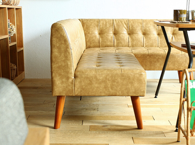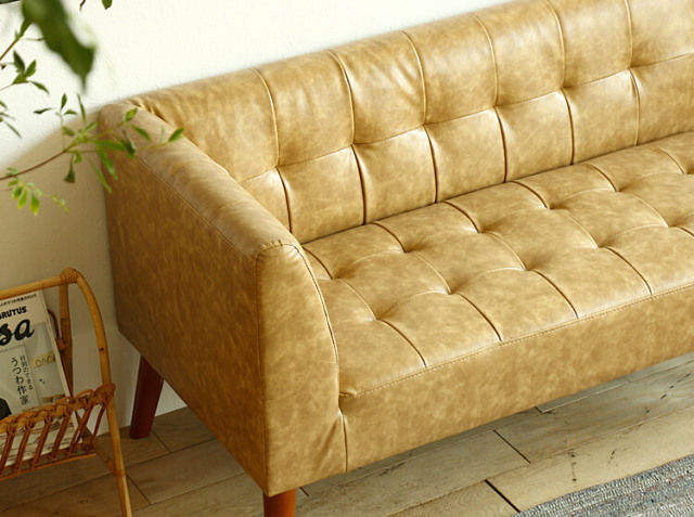 生地は、本革でよく見られる“シボ”=シワのような模様をエイジング加工を施すことで表現したバイキャストレザーを使用することで、まるで本物の革のような高級感を醸し出してくれるカウチソファーとなっています。またキャメルカラーの色味も、あえて少し薄めに仕上げることで昔から使っているかのようなヴィンテージ感もお部屋にもたらしてくれますよ♪