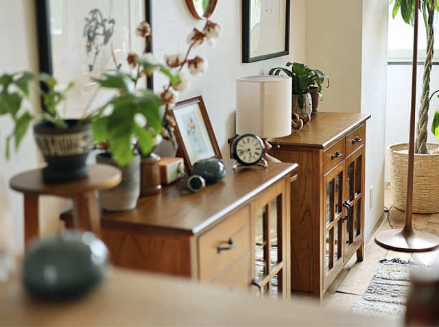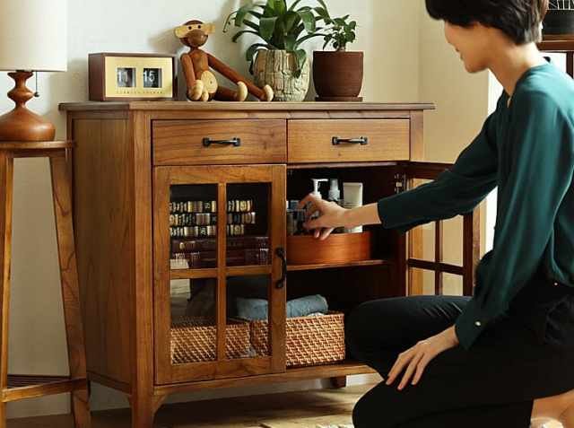 ゆっくりとくつろぐリビングには、細々とした文房具類や本など様々な日用品が集まりますので、いつも綺麗にしておきたいですよね。そんな時におすすめなのが、インテリアと収納を兼ね備えたキャビネット。お部屋に機能的なキャビネットが一つあれば、身の回りの物を一か所にすっきりとまとめることができて便利。またお気に入りのアンティークアイテムなどを天板に飾ったりすることでお部屋の中での“好きな場所”ができますよ♪