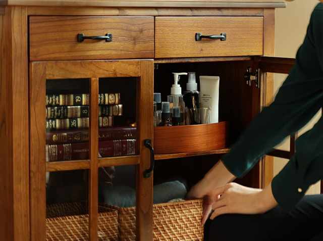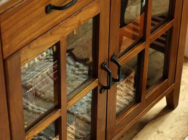 ヨーロッパのアンティーク家具のような味わい深いレトロテイストのデザインが特徴の引出し収納が2杯とガラス扉収納がついた幅80cmのキャビネット、Garba(ガルバ)。素材には高級家具や楽器などにも使われる天然木ミンディ材を使い、天然木の家具ならではの温もりや、使い古されたような風合いが、ほっこりとしたリラックス空間を演出してくれます。