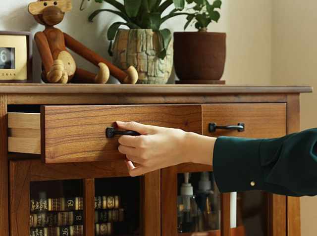 くっきりとした木目が印象的な天然木ミンディー材を使用。天然木ならではの木目の違いなどの個体差は自分だけのオリジナル家具のようで愛着がもてますよ。またアンティーク調のスチール製の取っ手を採用していますので、レトロな雰囲気を損なうことはありません。