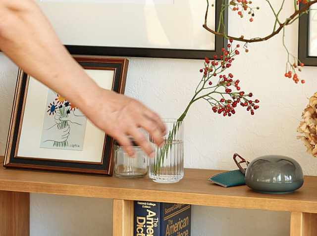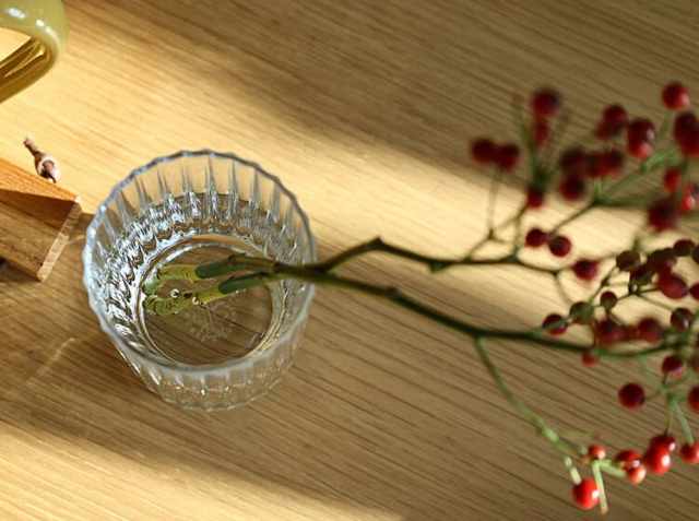 お気に入りのお花屋さんで季節の草花を購入し、少し短く枝を切り、1本、また1本と挿していきました。今の季節はやっぱり赤い実をつけた枝モノ♪食卓の上やキッチンカウンター、収納棚などに置くだけで、暮らしの中に豊かさを感じさせてくれますよ♪
